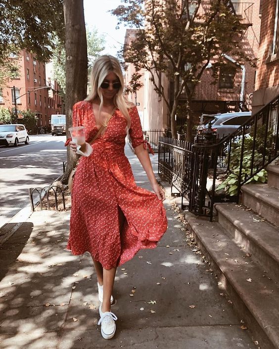 Look bem romântico e confortável. Aposte em vestidos fluídos usando tênis. Super combina!