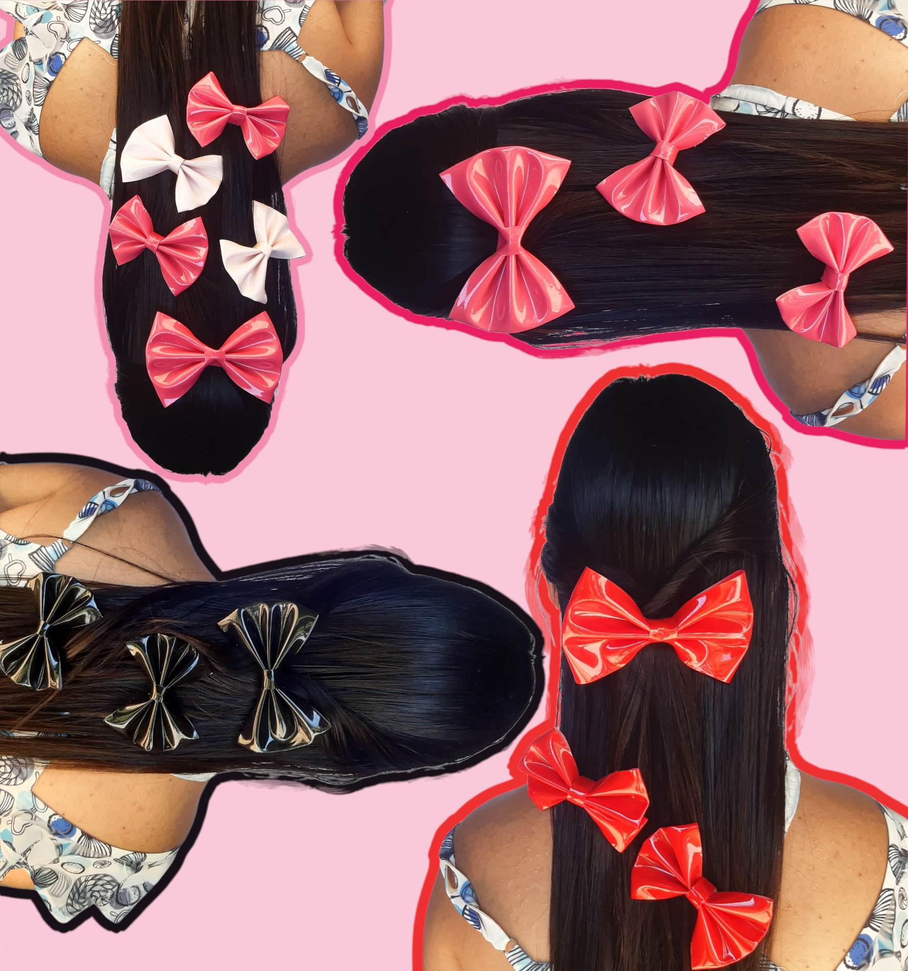 - rosa algodão, 2. azul malha, 3. vermelha crepe com orelhinhas, 4. preta cetim com orelhinhas, 5. preta tule com renda e orelhinhas, 6. cinza cetim com renda e orelhinhas.
